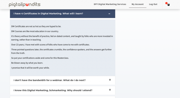 Look at how FAQs are used as part of the Landing Page at Pigtail Pundits for the Webinar Registration Landing Page.