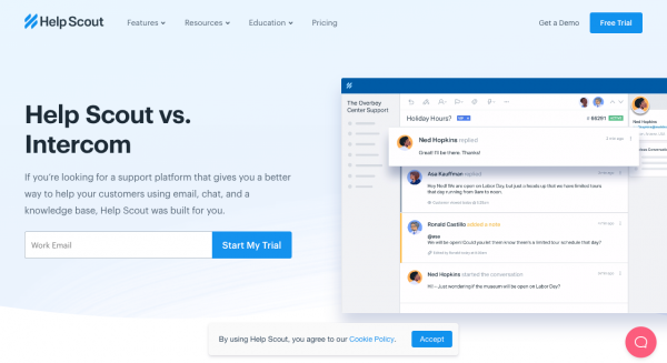 In the Landing Page below, Help Scout, an Intercom competitor, tries to hijack customers who search for Intercom with a better promise.